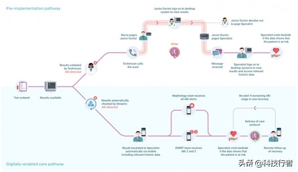 ▲相较于图上方所示的传统医生警报信息获取方式,图下方的DeepMind“Stream”应用建立起新的“数字化途径”。其主要创新在于让医生能够在手机上收取警报。