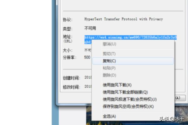 2、在弹出窗口中找到“地址(URL)”一栏,将这里显示的图片地址完整复制下来。(本示例中使用的浏览器是IE,有些其他浏览器右键点击图片后可以直接复制图片地址,就可以省略第二步了)