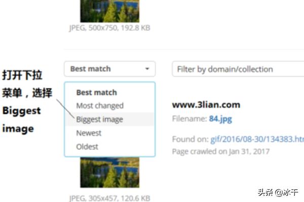 4、网站马上为我们找出了这张图片的许多版本,但怎么知道哪一张是原图呢?是这样的,后来转发的人通常会对图片进行压缩、切割处理,因此绝大多数情况下最大的图片就是原图。我们点开左边的下拉菜单,选择Biggest image。